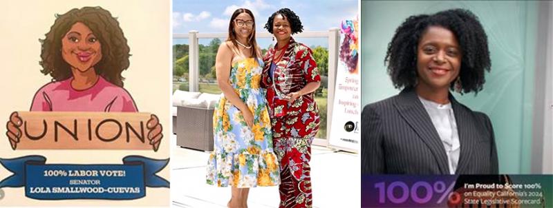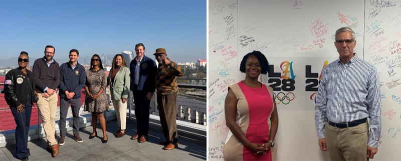 Left Photo: Gathered at the LA28 Exposition Park legislative tour are (from left) Assemblymember Tina McKinnor; Senator Ben Allen; Assemblymember Jesse Gabriel; Senator Lola Smallwood-Cuevas; Assemblymember Sade Elhawary; Senator Bill Stern; and former Senator Roderick Wright. Right Photo: Senator Smallwood-Cuevas meets with LA28 CEO Reynold Hoover at their Downtown LA headquarters.