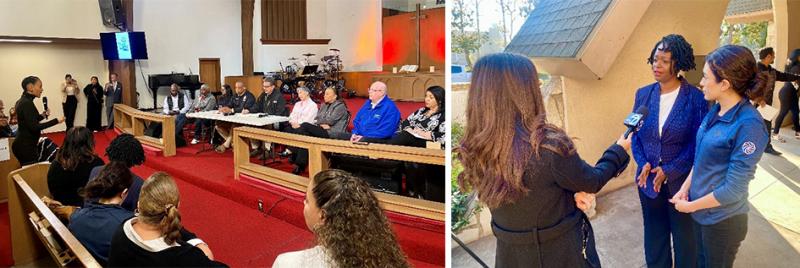 Left Photo: Altadena residents share their experiences from the LA wildfires during the listening session. Right Photo: Senator Sasha Renée Pérez joins Senator Lola Smallwood-Cuevas for a TV news interview about the listening session.