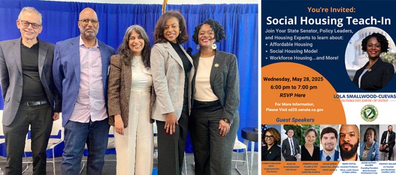 Left Photo: Shown at the Workforce Equity Summit are (from left) Dr. Manuel Pastor, Professor of Sociology and American Studies & Ethnicity at USC; Dr. Steven Pitts, former Associate Director of UC Berkeley Labor Center; Saba Waheed, UCLA Labor Center Director; Capri Maddox, LA Civil Rights Executive Director; and Senator Lola Smallwood-Cuevas. Right Graphic: A flyer promoting SD28’s virtual Social Housing Teach-In.