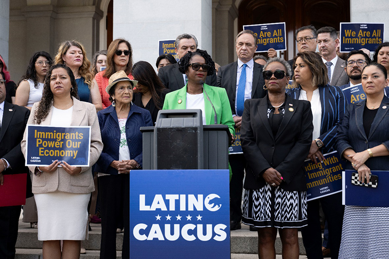 Senator Lola Smallwood-Cuevas stands with legislative colleagues at an immigrant rights press conference at the Capitol steps.